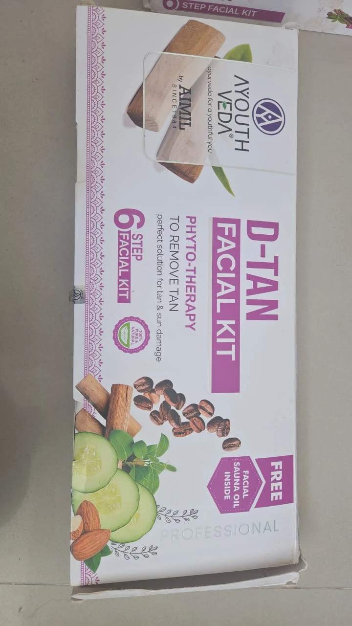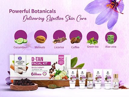 Ayouthveda D- Tan Facial Kit - an exclusive 6-step facial kit specifically designed to remove deep-seated tan, brighten the complexion, and heals sun-damaged skin. Phyto-therapy, the science of using plant-based ingredients, is incorporated into our formulations, making them free from harsh chemicals. The kit includes D-Tan facial cleanser for removing impurities and excess oil, D-Tan face scrub for gentle exfoliation & eliminating surface tan, D-Tan facial sauna oil to open clogged pores, D-Tan facial massage cream enriched with Aloe vera and Sandalwood oil to hydrate and nourish the skin, D-Tan face pack that rejuvenates and revives sun-damaged skin and finally D-tan face serum enriched with Kashmiri saffron to clear dark spots and give you a bright and glowing complexion.