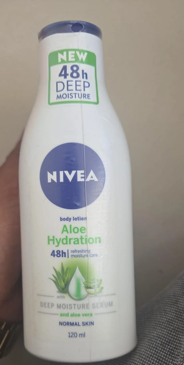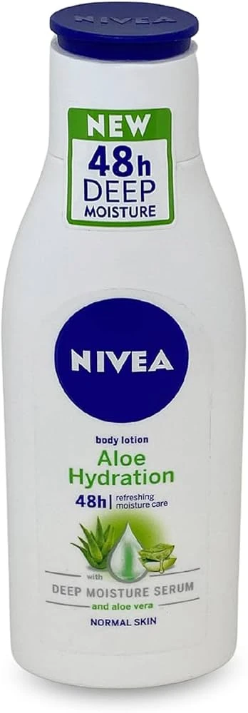 The product shown is the NIVEA Aloe Hydration Body Lotion for normal skin, which offers 48-hour deep moisture care.